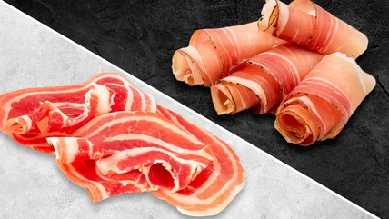 Italian speck has a more definite composition and flavor, as many producers adhere to a federally regulated process. The traditional Italian speck stems from the leg of the pig, which is rubbed down with a fragrant spice mix containing bay leaves and juniper. After marinating for weeks, the pork is smoked at a low temperature, then finished with a cure, sealing in water and creating a thick exterior crust. Such laborious processing steps create a pork product with a bold taste, equal parts spiced, smokey, and savory. It's a more flavor-heavy product than its famed cousin prosciutto, instead more closely resembling pricey pancetta.