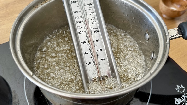 - Stir the corn syrup, sugar, and ½ cup water in a small pot and place on the stovetop over medium heat until the mixture reaches 300 F. Once the mixture is over heat, do not stir.