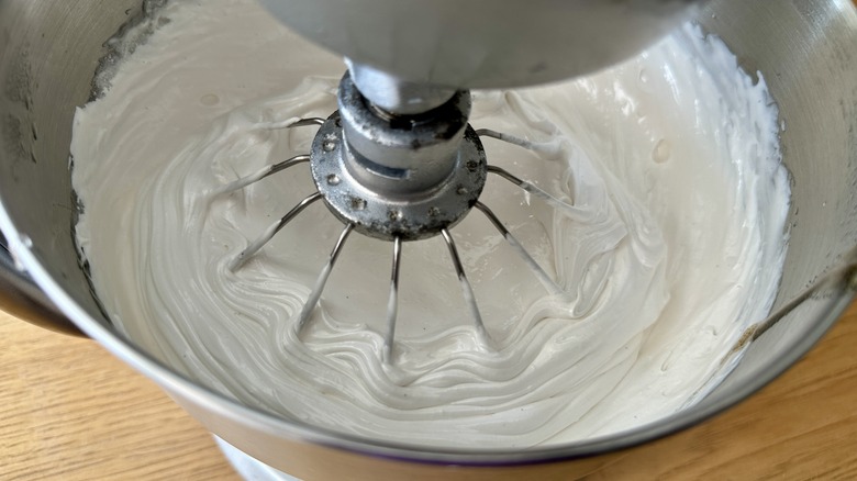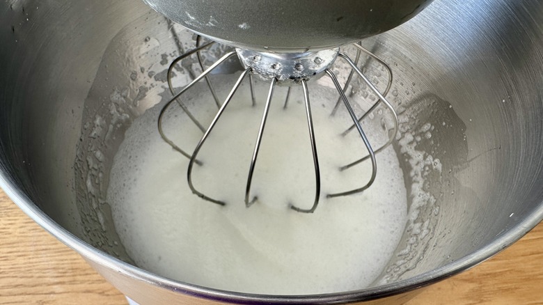 - Place egg whites into the bowl of a stand mixer fitted with a whisk attachment and start to whip on the lowest speed.