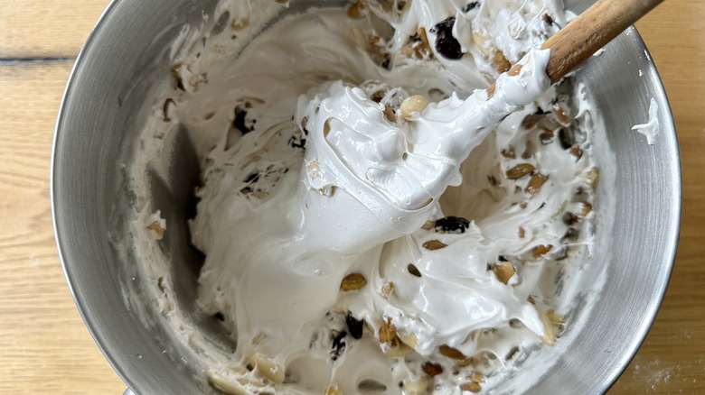 Increase speed of egg whites to medium. Slowly pour hot honey mixture down the side of the bowl into the egg whites, whipping to incorporate. Once added, reduce speed to low.