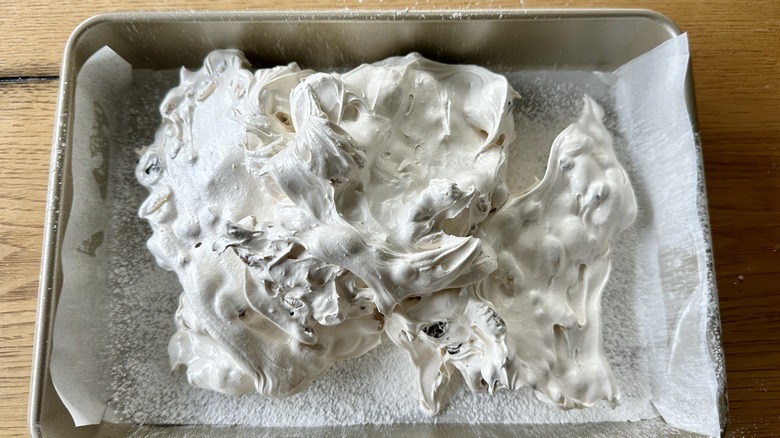 To prevent the candy from sticking to the baking pan, a combination of cornstarch and confectioners' sugar dusted over the parchment paper lining creates a nonstick coating. Rice paper can also be used for this purpose.