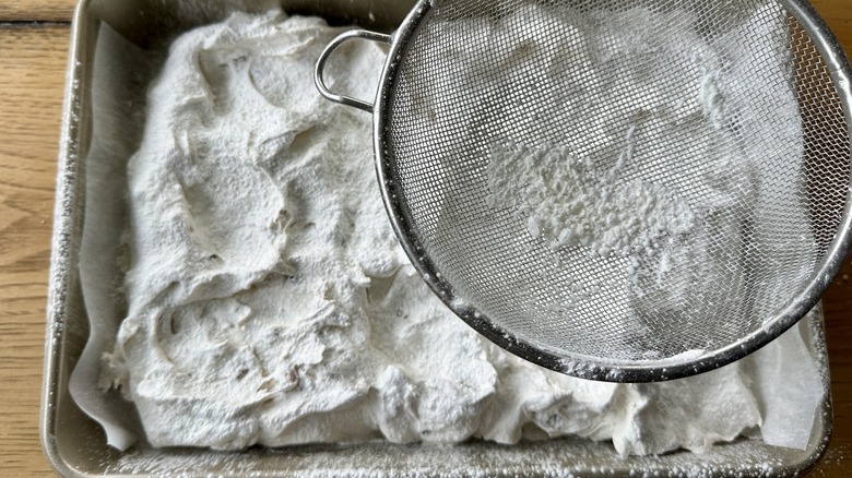 Sift a thin layer of the confectioners' sugar/cornstarch mixture evenly over the bottom of the baking pan, then set aside. You should have some sugar/cornstarch mixture remaining.