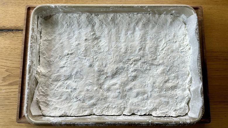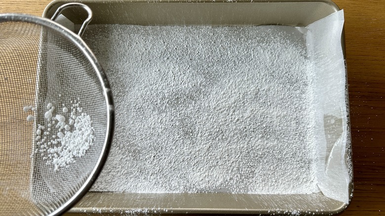 - Sift a thin layer of the confectioners' sugar/cornstarch mixture evenly over the bottom of the baking pan, then set aside. You should have some sugar/cornstarch mixture remaining.
