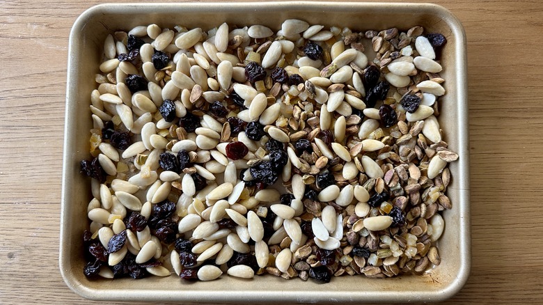- Combine the almonds, pistachios, dried cherries, and diced candied orange peel on a small baking sheet or pan. Place in preheated oven and turn off the heat. Leave inside until ready to use.