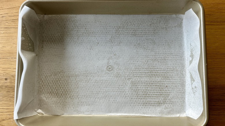 - Coat a 9x13-inch baking pan with cooking spray and line with parchment paper, leaving an overhang on both ends.