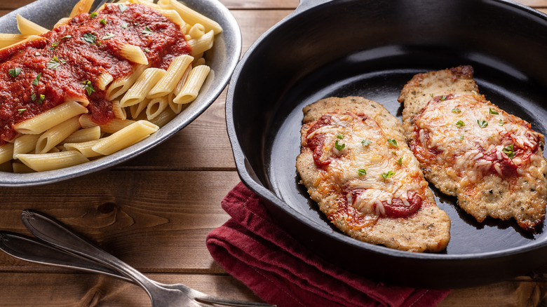 While chicken parm is often served with spaghetti in restaurants, it isn't mandatory. When preparing it at home you can choose anything from linguine and fettuccine to rigatoni and farfalle depending on your personal preference. However, each variety of pasta comes with its pros and cons. When choosing your pasta shape you need to consider three things — the thickness of your sauce, the texture of the chicken, and who you'll be serving it to.