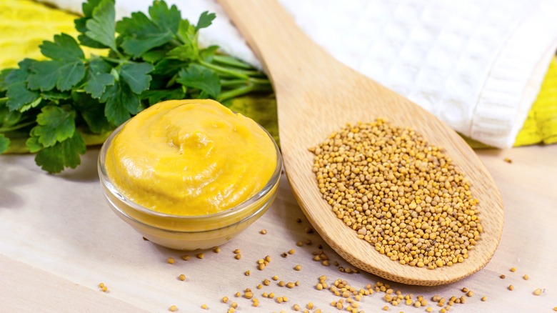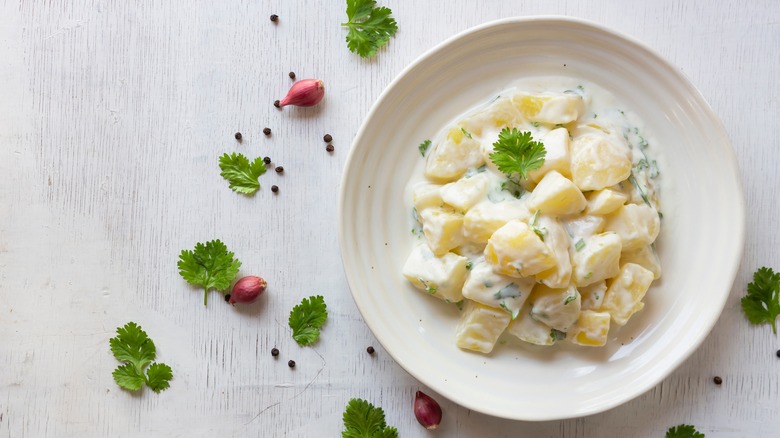 Potato salad is an all too familiar sight, not just at regular meals but also at potlucks, picnics, BBQ parties, and more. Given how often this dish makes its way onto the dining table, it's inevitable that it will get repetitive and a little dull over time. Luckily, there are copious quick fixes that will elevate your potato salad, and more often than not, you're just one ingredient away from a new and improved dish. For those who want a change impactful enough to elevate the flavors while still staying true to the salad's beloved essence, Dijon mustard is the answer.