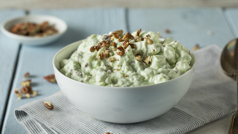 It shouldn't be too surprising that Watergate salad is at the bottom of the barrel. There are chunks of pineapple, pistachio pudding, pecans, marshmallows, and whipped topping involved — and frankly, we think it was something that a mad scientist conjured up in a fever dream. Not only does reading this ingredient list make us feel sick to our stomach, but so does the color of this mixture — which, in our opinion, screams "radioactive goop."