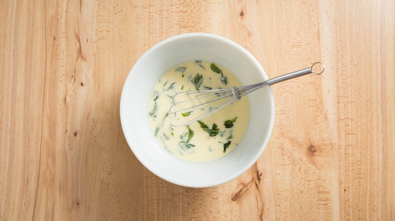 - Tear the basil leaves into pieces by hand and drop them into the egg mixture. Stir to mix.