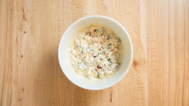 - Add the sun-dried tomatoes, feta, and olives to the flour mixture and stir well to coat them evenly.