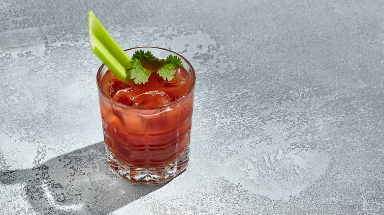 The ingredients you select for the body mix will help your Bloody Marianne lean more smoky, sweet, savory, or tangy. For instance, you could add maple syrup, Worcestershire sauce, celery salt, Old Bay, Tabasco or Cholula, lemon juice, and (of course) freshly cracked black pepper. The world is your oyster — but on the note of seafood, it's probably best to steer clear of Clamato juice here. The briny flavor might work in a neutral vodka Bloody Mary, but it'll compete with the bourbon in a not-so-great way.