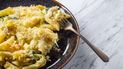 Although we love topping our fettuccine Alfredo — whether it has chicken or another protein — with garlic chips or breadcrumbs, the crunchy upgrade would work with any Alfredo pasta dish. Another one of our favorites is shrimp linguine Alfredo. The creamy sauce can also be used on pizza when you want something a little different than the classic red sauce. Pizza will also benefit from a crunchy garlic topping — you can add it to a simple cheese pizza or mix it in with a more complex array of toppings.