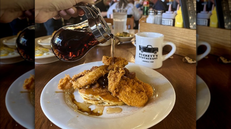 Puckett's Restaurant offers fried chicken for breakfast, lunch, and dinner with pancakes, on a sandwich, or the classic bone-in chicken with mashed potatoes and green beans. You can also order it as a "meat and three" fried chicken lunch special on Sundays (the meat options change depending on the day) with your choice of Southern sides, including mac and cheese, collard greens, baked beans, and cowboy caviar.