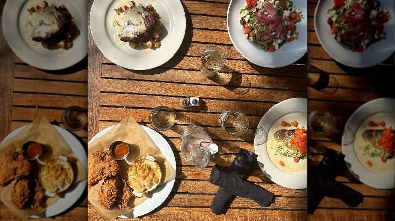 At Pinewood Social, you can get fried chicken and waffles or chicken, biscuits, and gravy for breakfast and brunch, or a fried half chicken drizzled with spiced honey for lunch and dinner. Customers describe the chicken as tender, moist, and flavorful no matter which way you get it, but Pinewood Social is as much about the environment as the food.