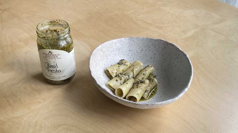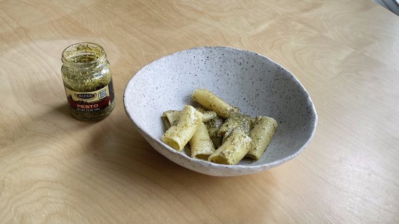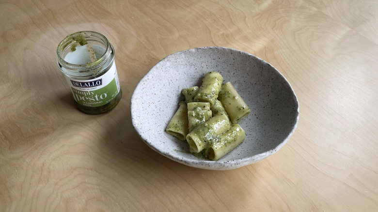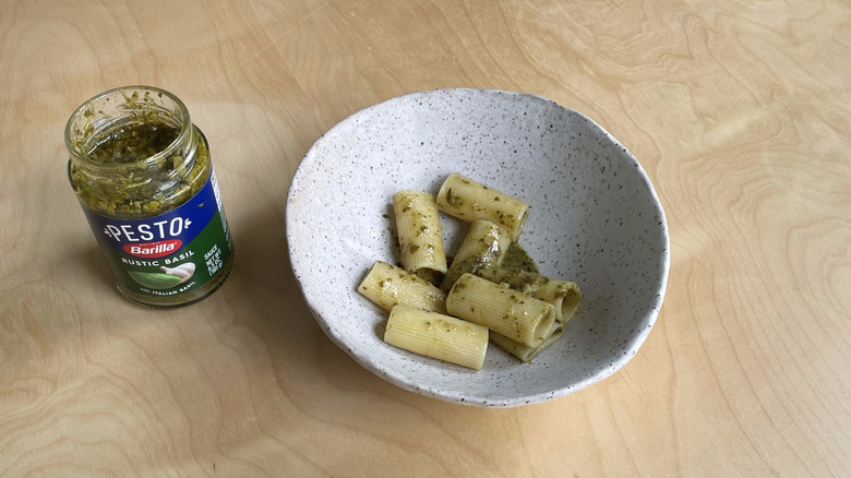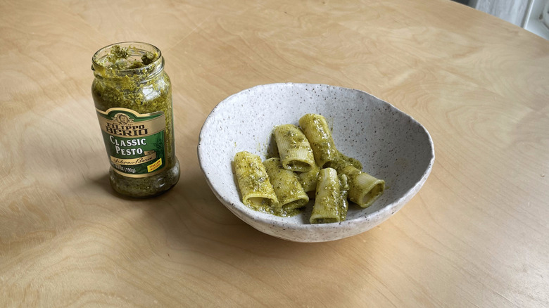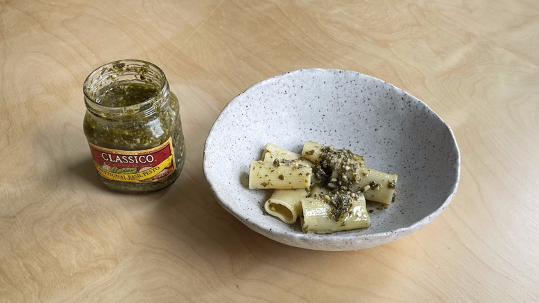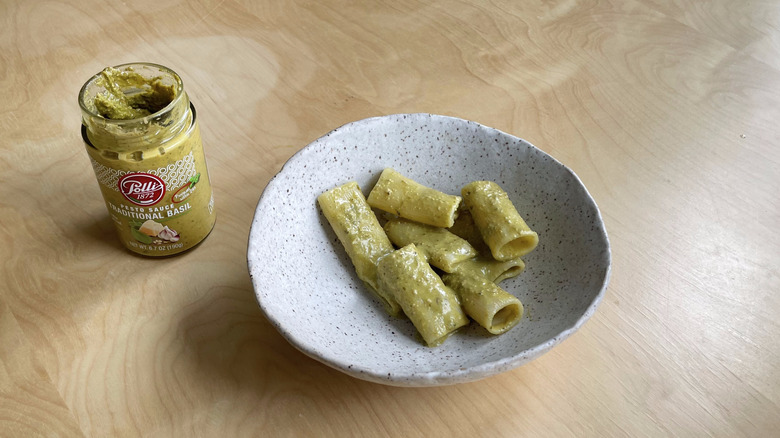 Some of the brands above, like Classico, note that this Italian condiment can be enjoyed as a sauce or a spread. Still, pesto will forever be synonymous with pasta, and so our taste-test held fast to tradition. We chose to test our pestos with rigatoni, a short shape, to evaluate how well the sauce clung to the noodles. We mixed each pesto with a bit of starchy cooking water to help it adhere to the noodles. Then, we gave it a taste while still warm, because, as they say in the Italian kitchen, pasta waits for no one. No additional garnishes, like cheese, black pepper, or salt were used.