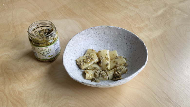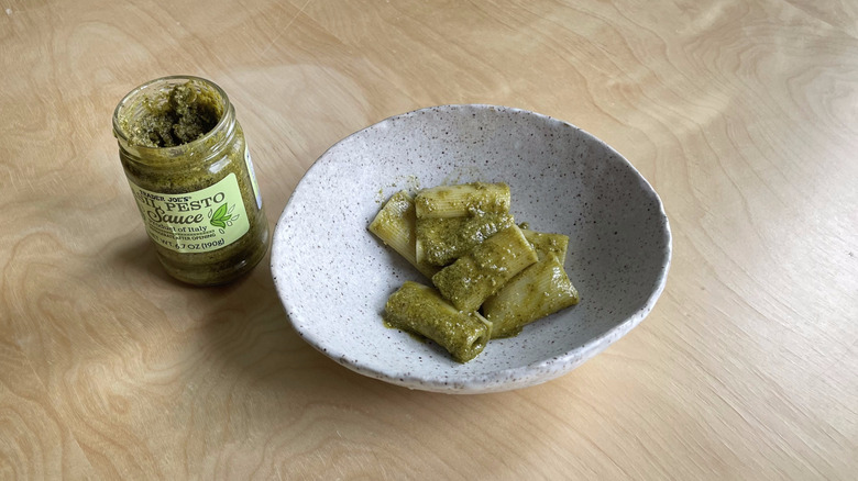 The question we find ourselves asking, then, is whether Trader Joe's olive and basil version is a tapenade masquerading as a pesto. Nothing is revealed after the first bite since the brininess is reminiscent of other brands we tried, but a quick peek at the back label gives us our answer. This pesto is primarily made with green olives, and thus, if you are a basil lover but an olive hater, you'd be wise to skip it. This concoction's only "pesto" quality comes from actual dried, not fresh, basil leaves, which are also this sauce's Achilles heel. Dried basil tends to taste musty, and there aren't any other redeeming qualities in this jar — no imported cheeses or "exclusively made with pine nuts" claims to justify tolerating this product.
