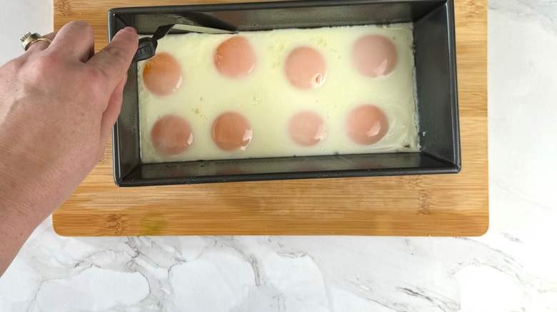 - Crack the eggs into the loaf pan.