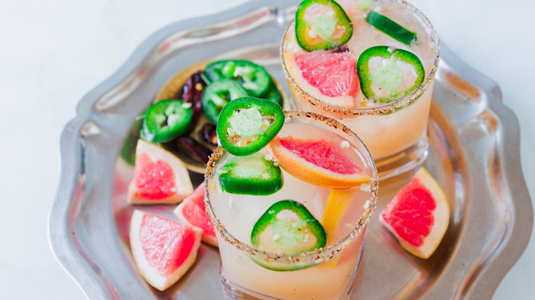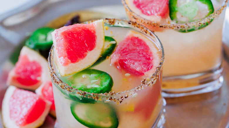 Margaritas may be a classic cocktail loved by many, and the adventurous among us will step forth and try this spicy grapefruit mezcal margarita. According to Ksenia Prints of At the Immigrant's Table, this unique take on the traditional margarita combines the smoky flavor of mezcal with the tangy sweetness of grapefruit, a kick of heat from two types of peppers, and a very special salty rim.