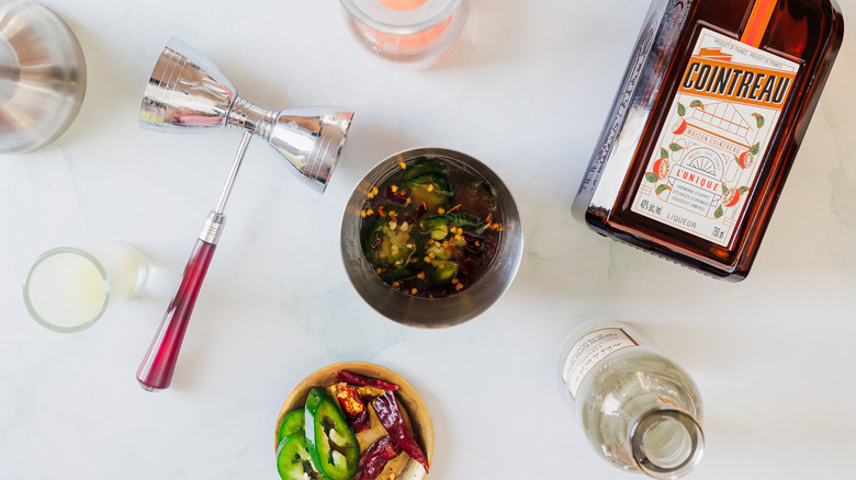 - In a cocktail shaker, combine the Mezcal, grapefruit juice, lime juice, Cointreau, crushed dried Mexican peppers, and half of the jalapeño slices.