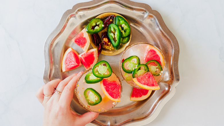 - Garnish with a grapefruit wedge and the remaining jalapeño slices. Serve immediately.