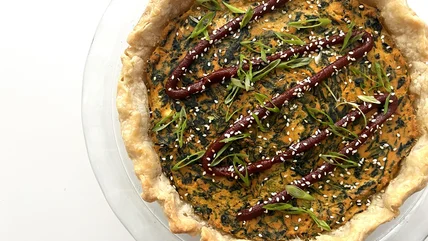 This singular vegan quiche takes inspiration from the Korean side dish sigeumchi namul by incorporating gochujang, soy sauce, and sesame into its tofu filling.