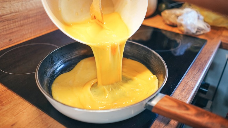 Child didn't state a specific amount to put aside but around a fifth of the whisked eggs would be a good quantity. However, to cook creamy scrambled eggs every time, it's worth following her whole process and not just her last-minute tip. Her style is slow and on low heat — both key elements when cooking soft scrambled eggs. While other chefs like Pépin recommend cooking scrambled eggs on high heat very quickly, this slower method is more manageable to people who aren't as agile.
