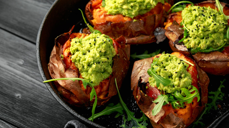 There are tons of different ways to prepare avocado for your russets or sweet potatoes. You can chop the fruit into small chunks and mix it with tomatoes and onions, or go for a creamier style and plop a spoonful of homemade guacamole, seasoned to your liking, on top. From there, you can make different variations on your recipe with other ingredients. If you're eating a baked potato for breakfast, for example, add a fried egg and crumbled bacon to the top of your baked potato with the avocado. Or, make a burrito bowl out of your spud by spooning in seasoned meat, beans, and corn with guac and sour cream. Not only do you get a healthy dose of fat with this fruit, but also an electric pop of color that will make your starch stand out.