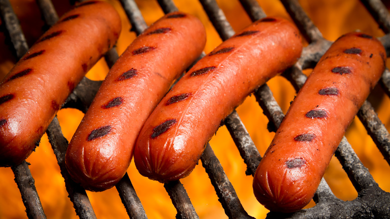 Hot dogs tend to be on the large side, so you'll want to ensure you use a large enough baked potato to capture all that meaty goodness. Then, once your hot dogs are done cooking on the grill (which can be a shared cooking surface for your potatoes), you can cut your spuds in half and stick the hot dog in between.