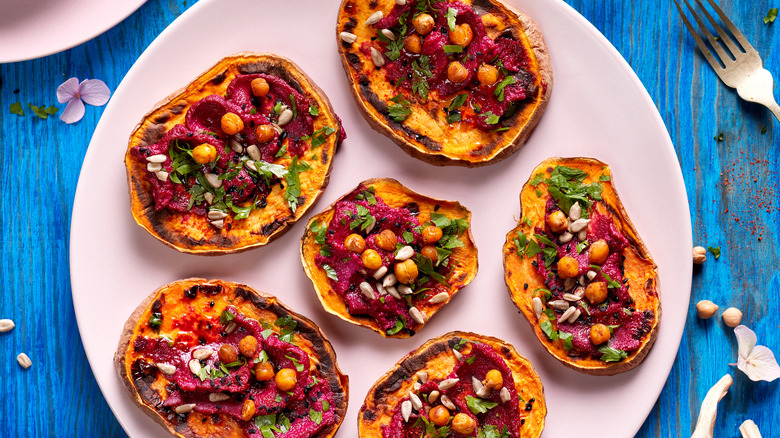 Once you've slathered hummus into your sweet or regular potato, you'll want to add some crunchy or bright toppings to help balance out the one-note texture of the hummus and soft potato flesh. For a Mediterranean-inspired potato, you can add a sprinkle of chopped garlic on top, crispy chickpeas, crumbled feta, and fresh dill. Or stick to charred corn, chipotle, and cotija cheese for a Tex-Mex recipe.