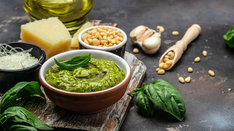 Pesto is one of our favorite condiments because it concentrates the herby notes of basil, umami Parmesan, decadent pine nuts, and good olive oil into a singular sauce. But don't just stick to adding pesto to your pasta when there's an even more creative way to use it: as a topping for your baked potatoes.