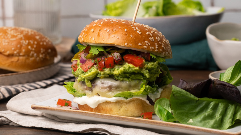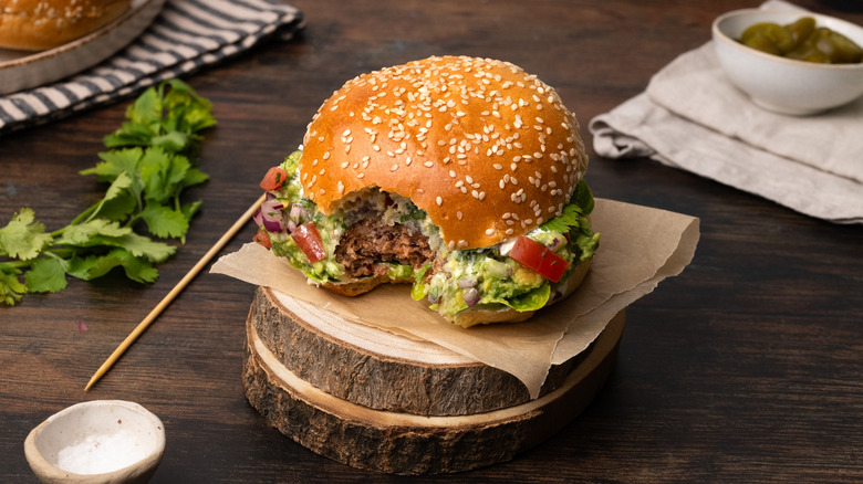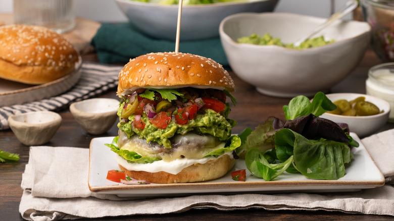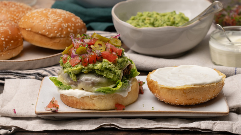 - Assemble the burgers: Slice a bun in half and, starting with the bottom bun, layer sour cream, lettuce, a cheese-topped patty, guacamole, pico de gallo, and the remaining ¼ cup of jalapeño slices.