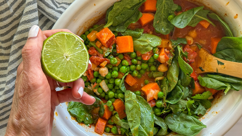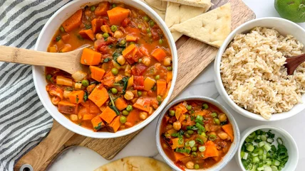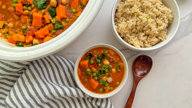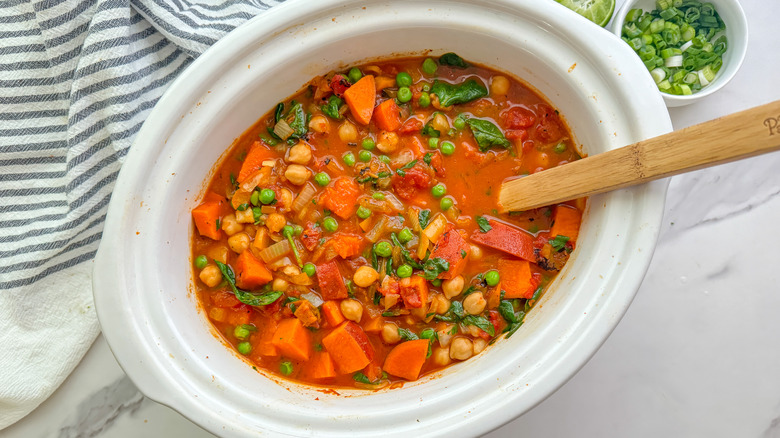 Put your slow cooker to good use with this hearty vegetable curry recipe, which features sweet potatoes, chickpeas, spinach, and peas.