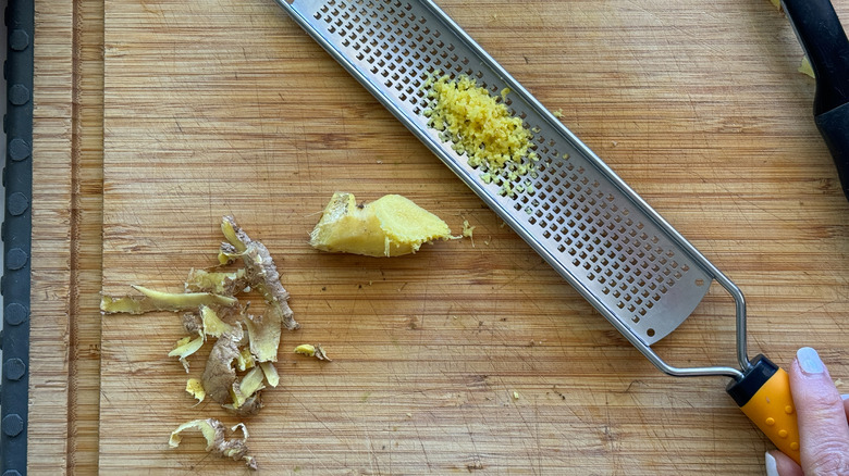 - Peel the ginger root and grate using a microplane.