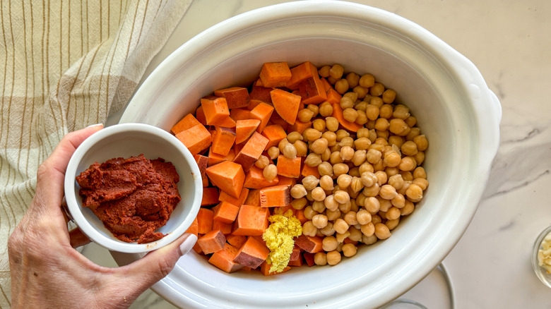 - Add the grated ginger, onion, sweet potato, bell pepper, garlic, chickpeas, broth, fire-roasted tomatoes, coconut milk, red curry paste, soy sauce, cumin, salt, and pepper to the slow cooker.