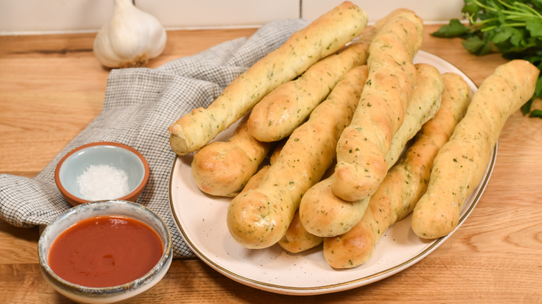 Many dried herbs can offer stronger flavors than fresh herbs, so it will not take much Italian seasoning to spruce up homemade baked breadsticks. It's exactly how Tasting Table recipe developer Alexander Roberts achieves next-level flavor in our easy garlic and herb breadsticks. In the recipe, Roberts uses just 1½ teaspoons of Italian seasoning combined with kosher salt, freshly chopped parsley, and minced garlic cloves that are mixed into the dough, which is enough to make 10 breadsticks. Use your favorite brand of Italian seasoning to make it happen or create a homemade batch with the dried herbs in your spice cabinet.