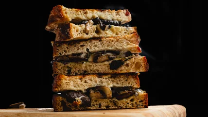 We chose this combination of three different mushroom varieties to add depth and complexity to the sandwich's flavor profile. The meaty texture of the portobello mushrooms, the delicate earthy notes of the white mushrooms, and the velvety oyster mushrooms — which you can eat stems and all — create a study in contrasts that makes the sandwich anything but boring. Expertly sauteed with garlic and simply seasoned with salt and pepper, these mushrooms are an umami bomb waiting to meet the creamy, tangy Boursin cheese and the nutty, slightly sweet Comté. The toasted sourdough bread provides the perfect crispy exterior, contrasting beautifully with the warm, melty interior. The result is a delicious and satisfying sandwich that's perfect for a cozy lunch or with a salad or a bowl of soup for a quick and easy dinner.