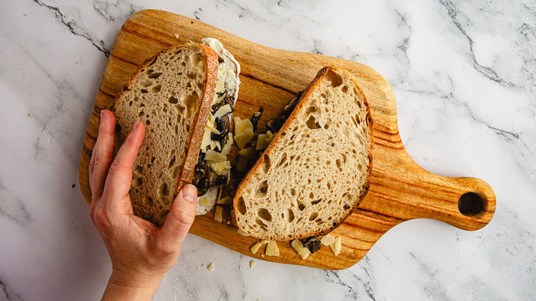 Alternatively, you can simplify the process by turning the sandwich into an open-faced mushroom bruschetta. Toast or grill the bread slices, top them with the sauteed mushrooms and then sprinkle the cheese over the top. Broil or bake until the cheese melts and bubbles, resulting in an easy-to-assemble variation of the original recipe.