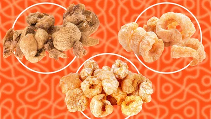 Pork rinds are probably the most familiar option if you're American. These crispy and puffy versions of fried pork skin are almost translucent in some spots because of aeration. Rinds only use the skin of the pig — unlike similar snacks that fry fat with the skin.