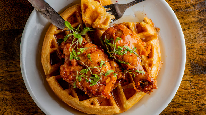 Chicken and waffles will forever be a quintessential brunch dish. The sweet and savory Southern classic never gets old, and we will never tire of finding ways to spruce it up. Whether you give it a squeeze of strawberry jam or add a pat of spiced honey butter, it never hurts to add a little something extra to the dish. If you prefer yours with a fiery kick, though, you'll find that spicy maple syrup is the perfect way to upgrade chicken and waffles.