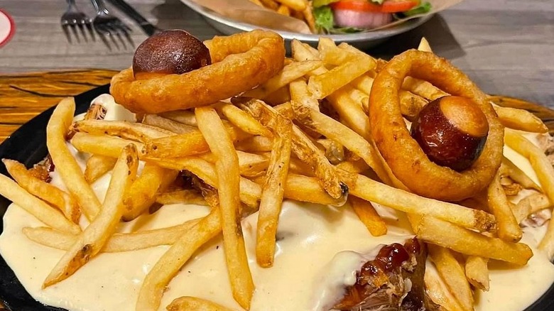While horseshoe sandwich aficionados may play fast and loose with ingredients, the Illinois staple isn't without controversy. Steve Tomko, a dishwasher in Schweska's kitchen at the Leland Hotel, later claimed credit for creating the sandwich. While that claim has been debunked — Tomko stepped forward only after Schweska died — there's another widely debated point of contention: Does the cheese sauce go on top of the fries to crown the dish, or do the fries go on top of the cheese sauce? We don't know for sure, so we'll consider that choice a matter of personal preference.