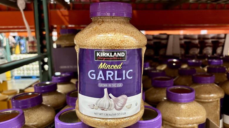 Kirkland Signature Minced Garlic comes in a really big 48-ounce bottle for only $7. But don't be fooled. If it seems like this deal is too good to be true, it is. Despite being — okay, fine — a viable option when fresh garlic is unavailable, this pre-minced garlic's dullness pales in comparison to the aromatic punch of freshly chopped garlic. The garlic is literally packed in water, which in and of itself dilutes its flavor. Plus, there's really no telling when it was originally skinned and chopped. This convenience comes at a cost, as some cooks may find its flavor lacking, particularly in dishes where garlic plays a central role.