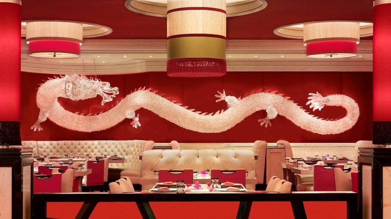 The interior at Mr Chow (in its Caesar's Palace location) is beyond stunning. The entire space appears designed to grab your attention and keep it. From moving art installations to chefs on display to a roaming champagne trolley, it's a sight to behold.