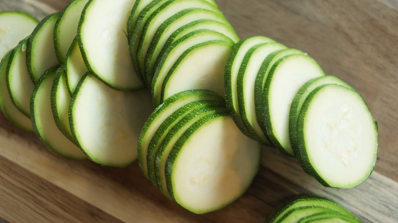 Zucchini is a remarkably versatile veggie, both cooked and raw. The firm texture means it holds up well when shaved or spiralized. Spiralized zucchini is a popular substitute for spaghetti. Shaved on a mandoline, it works well in salads — like this shaved summer squash salad that pairs fresh yellow zucchini with ricotta. And, while it's not a one-for-one substitute for cucumber, you can still use it in many of the same recipes. It's great if you want a little more crunch than cucumber would provide, so consider using it in lieu of cucumber on charcuterie boards.
