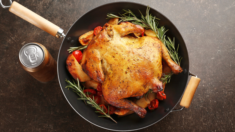 If you want to skip the chicken with beer brine but still want beer-based flavors, you can always make beer-can chicken. It's an unusual take: grilling a chicken while it sits upright with a beer can stuffed in it. This is done so that the beer evaporates right into the bird and seasons it from the inside. Guaranteed the magnificent flavors will make up for the peculiar setup.