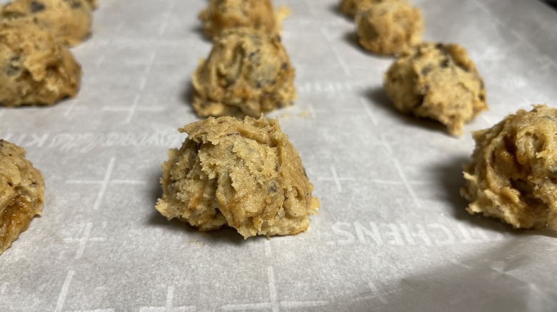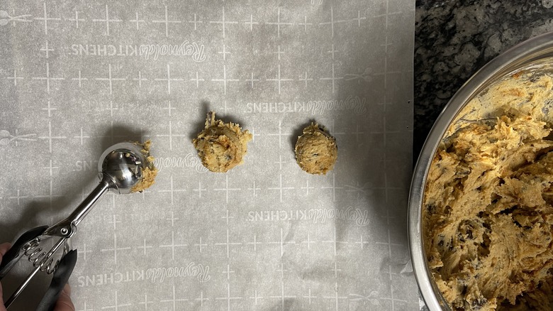 - Scoop small mounds of cookie dough onto parchment-lined baking trays, spacing the cookies at least 4 inches apart. Top with the reserved chocolate chunks and freeze for an hour (or refrigerate overnight).