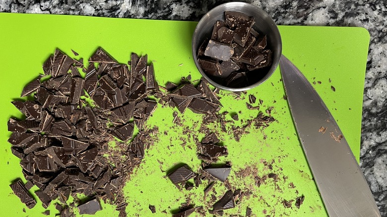 Roughly chop the dark chocolate, then set aside a small handful to use for topping the cookies.