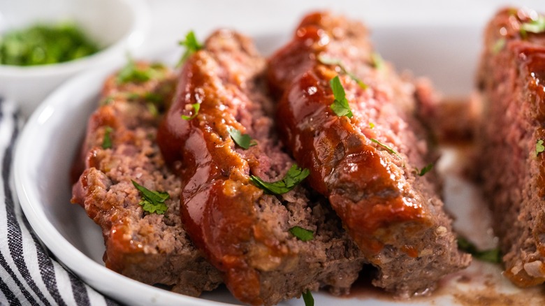 Another mandatory supply in Elvis Presley's fridge was everything required to make meatloaf — he clearly ate the dish frequently. And, just like with the peanut butter and banana sandwiches, you can recreate this dish the way Elvis ate it. In this case, the recipe is preserved thanks to the "The Presley Family Cookbook," which was co-written by Elvis' uncle, Vester Presley, and another one of his cooks, Nancy Rooks.