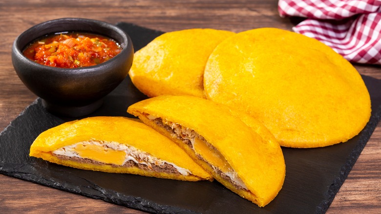 The breakfast component comes in with the fillings. While it's possible to eat arepas at any time of the day or night, arepa de huevos can function as an above-average breakfast experience. And it's incredibly simple to make — because who wants to create a complicated meal first thing in the morning? Just make the arepa dough, fry it up, and crack an egg into the center pocket of each one. Then, you'll want to cook the patty until the egg white has solidified.
