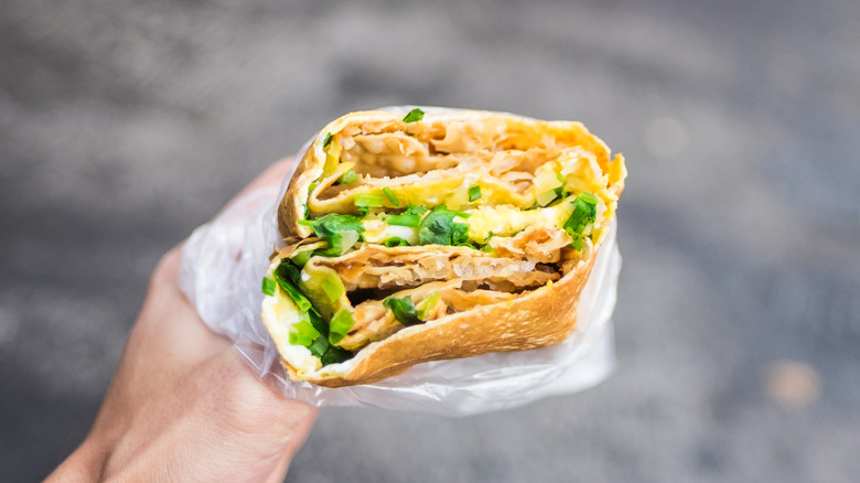 Bread is not a particularly big hit in China, at least not as much as in the U.S. So, when it comes to sandwiches or sandwich varieties, you're more likely to find a starchy exterior made from a different kind of batter. That's the case with jianbing, a Chinese crepe made with mung bean flour. After it's cooked, it's filled with delights like eggs, hoisin sauce, and fried wontons.