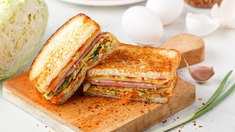 Korean cuisine pairs sweet and savory flavors better than most, so it's no surprise that this flavor combination can also be found in Korean street toast, also known as Gilgeori toast. It's a tasty and filling sandwich often enjoyed as a quick breakfast or dinner throughout South Korea. You'll find an egg, vegetable patty, ham, and cheese, all stuffed between two slices of sweet buttered bread.